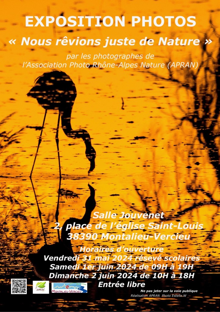 Les membres de l’Association Photo Rhône-Alpes Nature (APRAN) ont le plaisir de vous inviter à leur première exposition photographique « Nous rêvions juste de Nature » qui se déroulera les 1er et 2 juin à MONTALIEU-VERCIEU dans l’Isère.